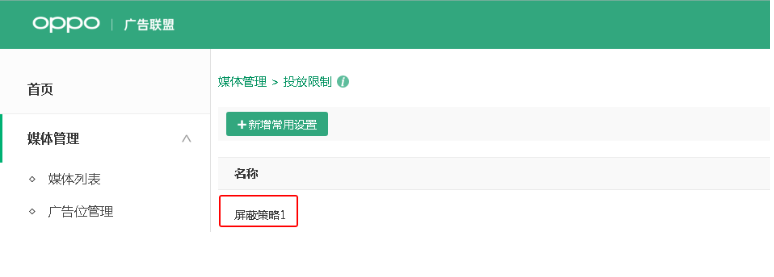 后台点击“媒体管理”→“投放限制”→“+新增常用设置”