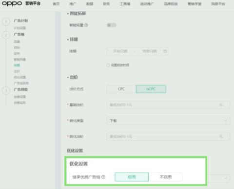 当前仅支持在创建新广告组时使用该功能,点击"启用"继承优质oppo手机广告组后,可以输入同账户下在线的优质oCPX广告组ID