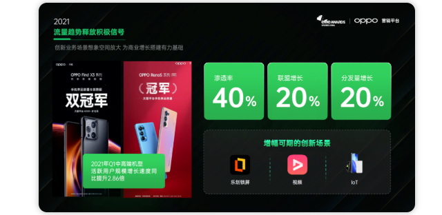 得益于终端市场规模的扩大,OPPO活跃用户和流量也迎来了新的增长。同时,OPPO广告渗透率已经达到40%以上,联盟流量和广告分发量也有大幅的增长。除了这些流量之外,以乐划锁屏、视频、IoT为主的OPPO创新场景未来也将成为流量增长的新场景。