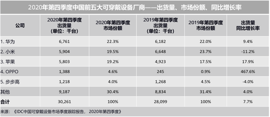 另一个潜力较大的领域是可穿戴设备。IDC数据显示,截至2020年第四季度,OPPO在可穿戴设备市场以4.6%的份额排在第四位,与第一名华为存在17.7个百分点的差距。反映到出货量上,华为约是OPPO的5倍。