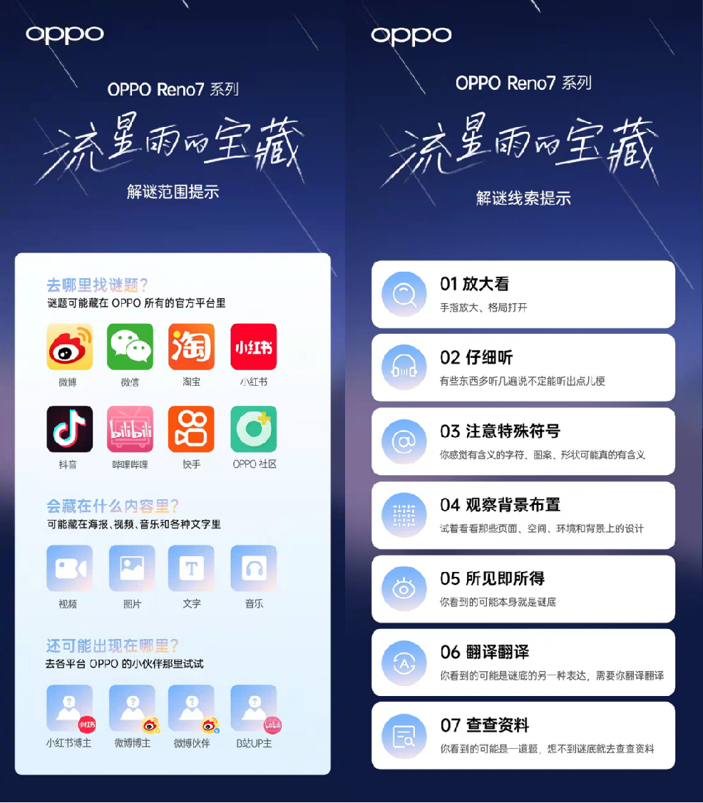 近日,OPPO手机在新品Reno7发布之际,发起了一场「流星雨的宝藏」解谜挑战活动。